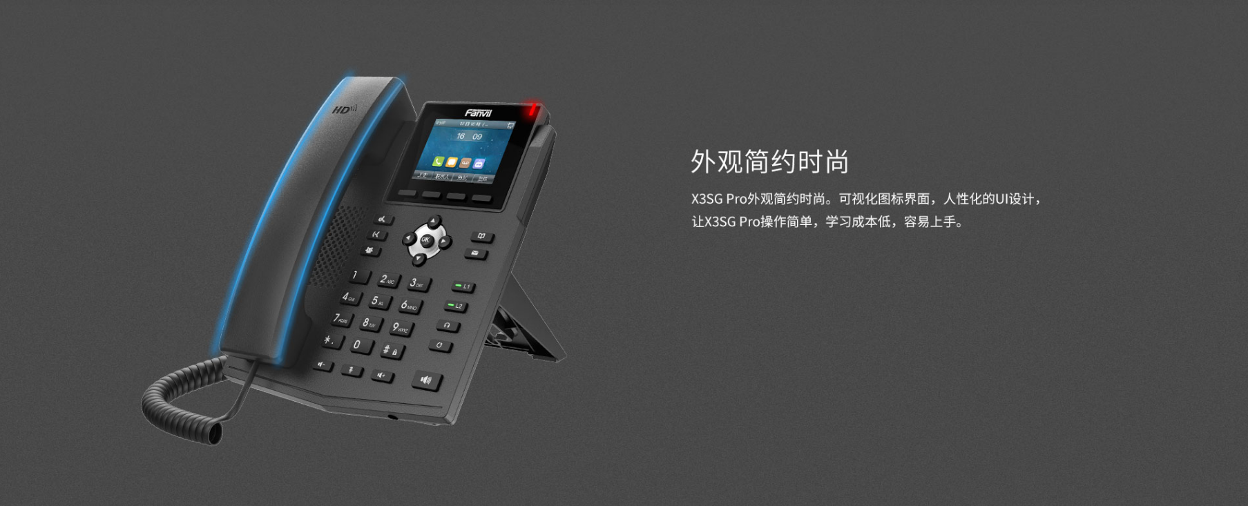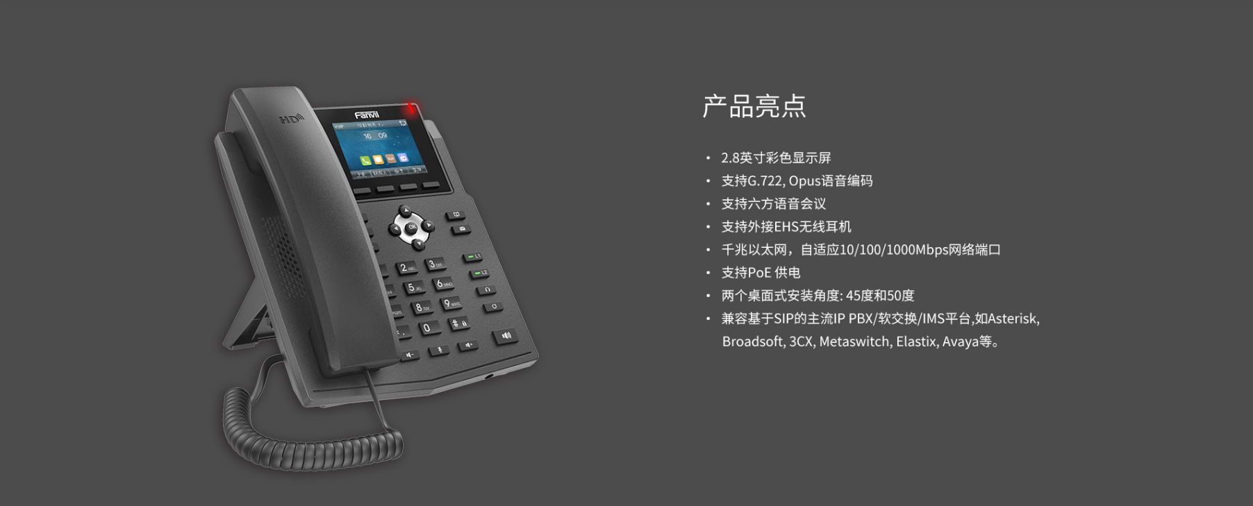 X3SG Pro是一款高清彩屏千兆IP话机,拥有商务优雅外观,配备2.8英寸彩色主屏。X3SG Pro功能强大,具有高清语音功能,支持宽带音频解码G.722和Opus,支持千兆以太网,4个SIP账号,支持PoE供