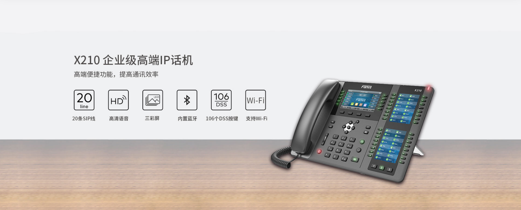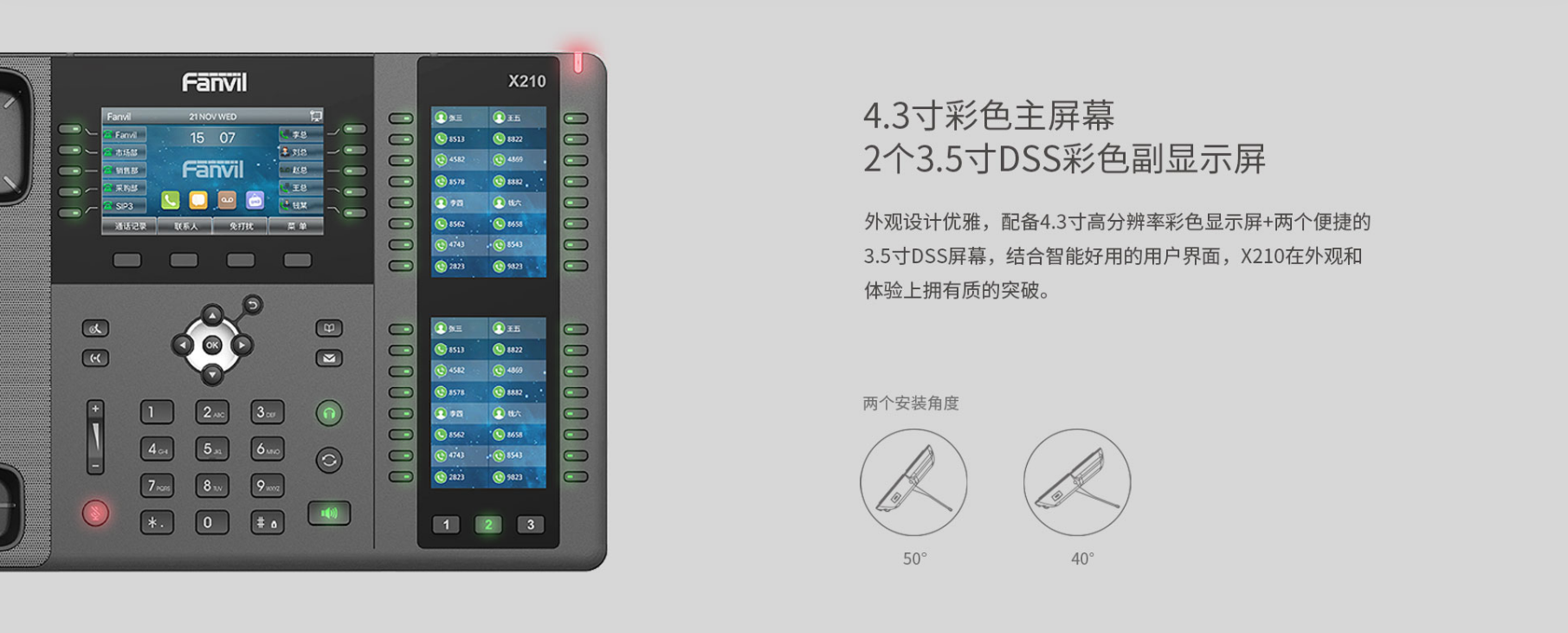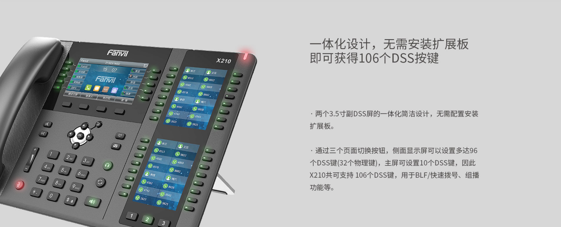X210是一款高端商务IP话机,适用于需要灵活性和高级功能的用户,以便在工作中轻松应对繁忙的电话通讯。X210的4.3英寸主彩色显示屏上有10个DSS按键,两个3.5英寸侧面彩色显示屏上最多