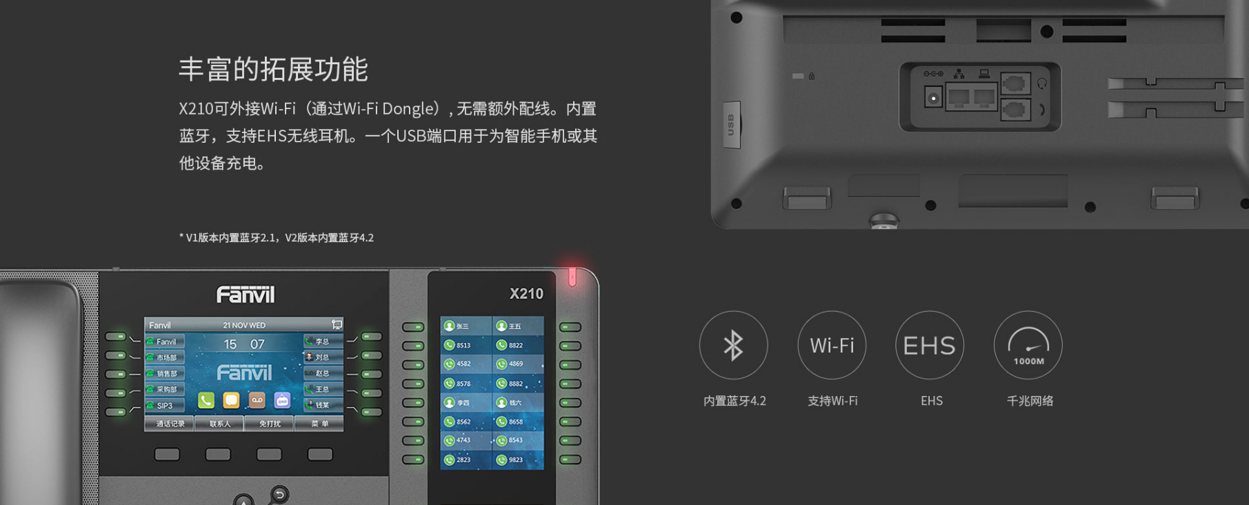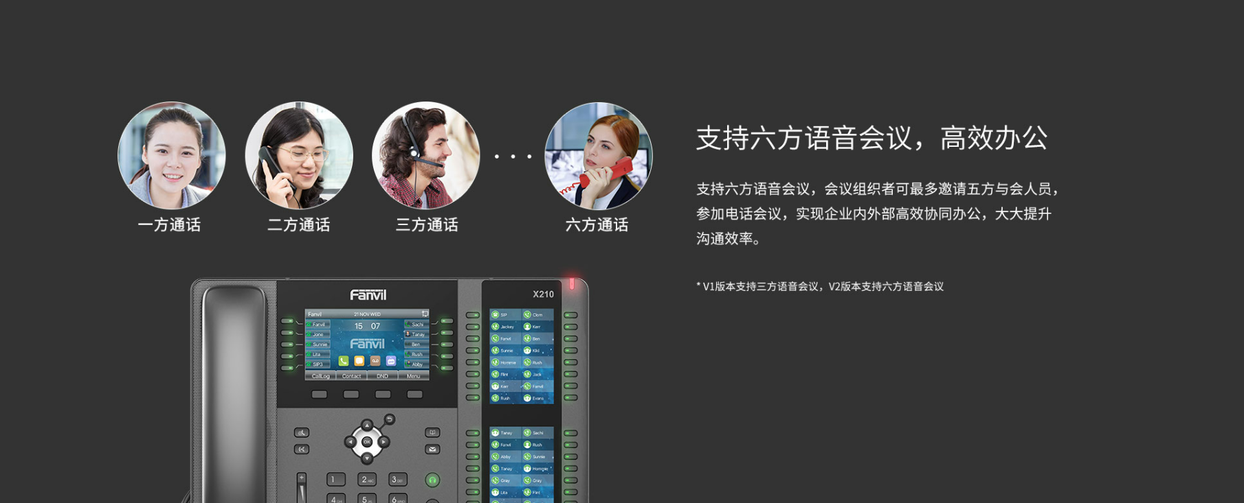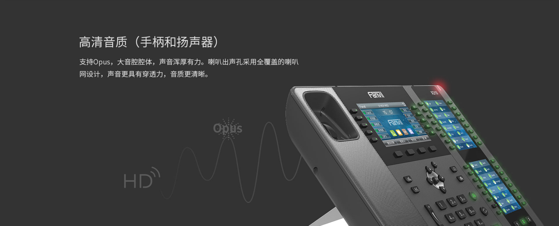 X210是一款高端商务IP话机,适用于需要灵活性和高级功能的用户,以便在工作中轻松应对繁忙的电话通讯。X210的4.3英寸主彩色显示屏上有10个DSS按键,两个3.5英寸侧面彩色显示屏上最多